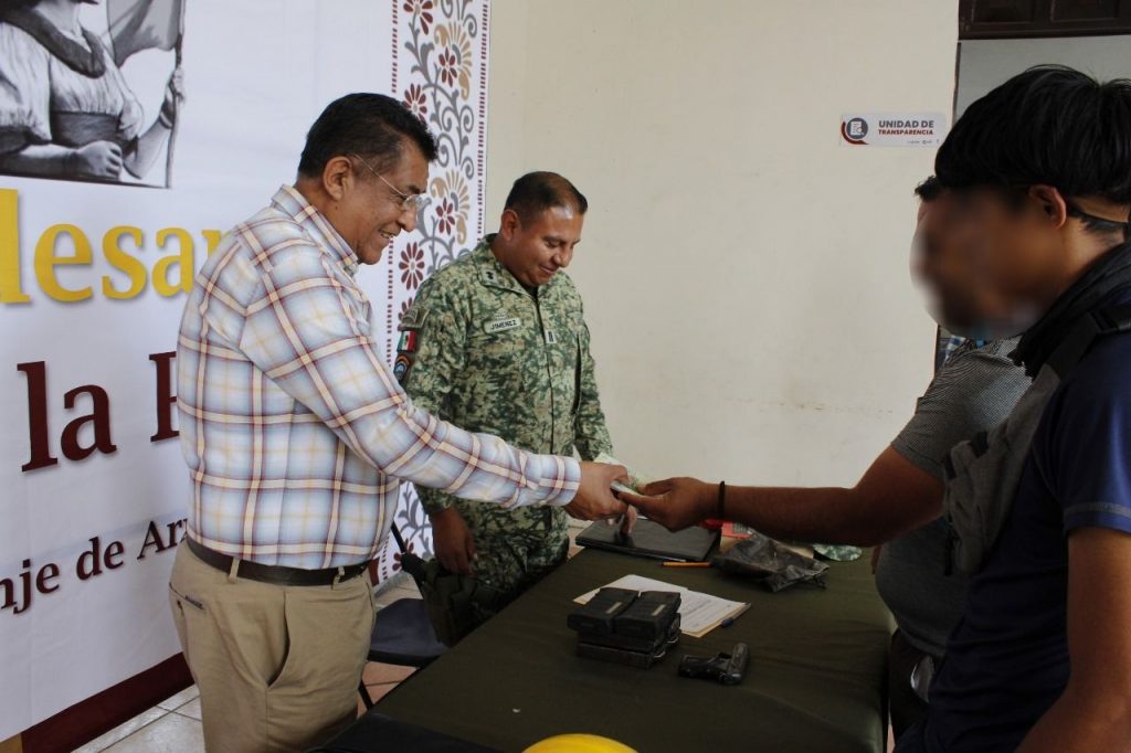 En el marco de esta iniciativa, este martes, el Presidente Municipal, Raymundo Andrade Rivera, hizo entrega de un estímulo económico a una persona que acudió de forma voluntaria y anónima a canjear un arma de fuego, como parte del esfuerzo colectivo por fortalecer la seguridad y la paz social en el municipio.