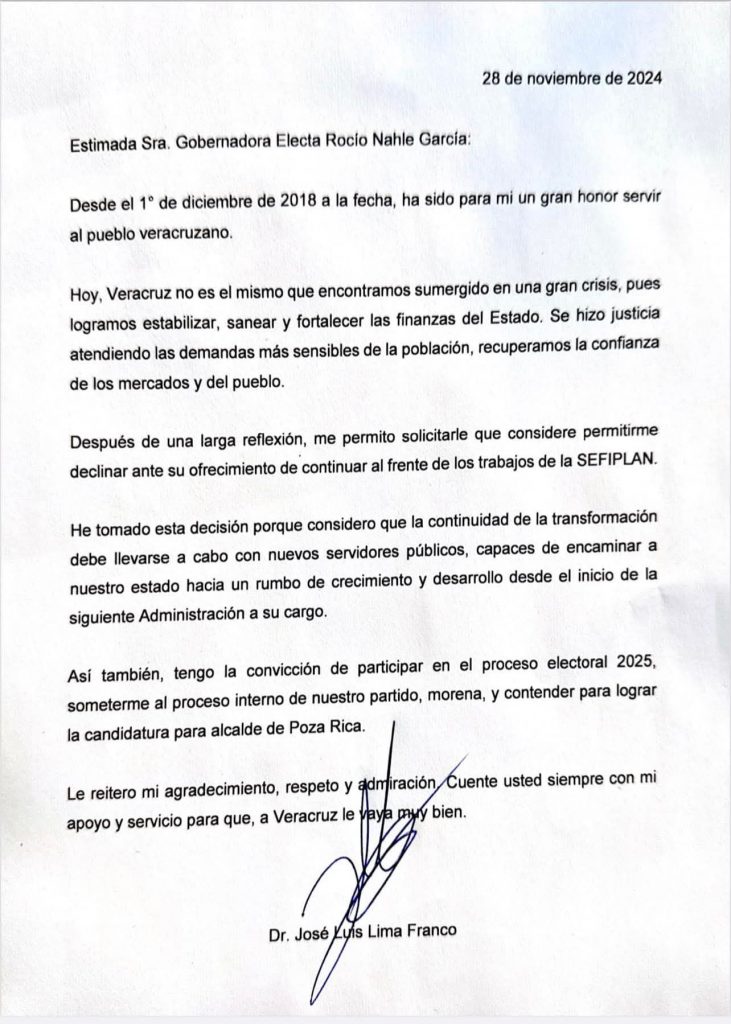 José Luis Lima Franco quien había sido ratificado por la gobernadora electa Rocío Nahle García como titular de la secretaría de Finanzas y Planeación, decidió declinar la invitación debido a que tiene aspiraciones políticas para buscar la alcaldía de Poza Rica.