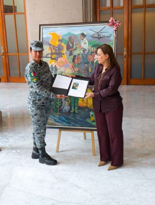 Esta fecha mujeres del Ejército, Fuerza Aérea y Guardia Nacional, en el marco del *”Día Internacional de la Mujer”* y para patentizar la importancia de la mujer militar en el Desarrollo de Veracruz, entregaron a la Gobernadora de Veracruz la Pintura titulada “POR AMOR A MÉXICO Y VERACRUZ” acompañada del certificado de autenticidad y reseña de la obra.