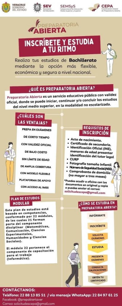 De la misma forma, se puede consultar en Facebook la página de la Coordinación Estatal de Preparatoria Abierta; el sitio web www.sev.gob.mx/preparatoria-abierta o enviar un correo electrónico a la dirección solicitudescepa@gmail.com, para que no dejes pasar esta oportunidad.