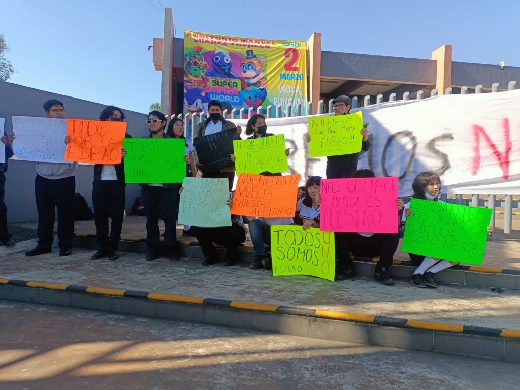 Córdoba, Ver. En Córdoba, en la mañana de este miércoles, jóvenes estudiante de la escuela secundaria y de bachilleres de artes y oficios, se manisfersaron con pancartas y lonas, afuera de las instalaciones del auditorio “Manuel Suárez”, conocido popularmente como el “Auditorio de la Esbao” esto porque señalan los estudiantes no se les presta, bajo ninguna circunstancia y no es utilizado para los fines para los que fueron construidos.