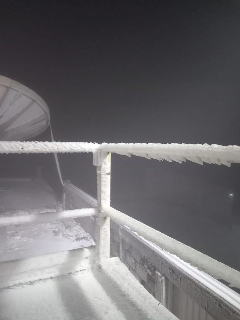 “Durante la noche de ayer se registró ligera caída de nieve (segunda de la temporada 2025-2026) en la cima del Cofre de Perote. Esta mañana, debido a la alta humedad y las bajas temperaturas, lo que predomina es cencellada (hielo adherido a superficies)”, posteó en redes.
