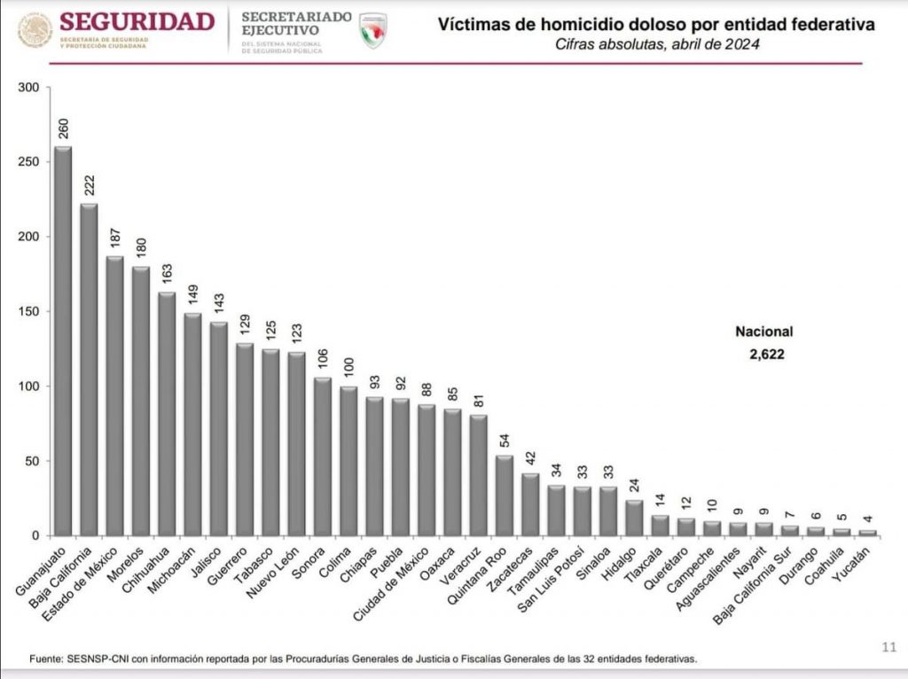 El reporte indica que los estados de Guanajuato y Baja California, se encuentran en los dos primeros sitios, con 260 y 222 homicidios, respectivamente, en ese mismo periodo.
