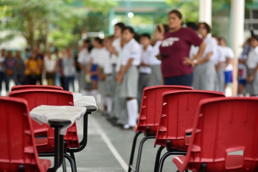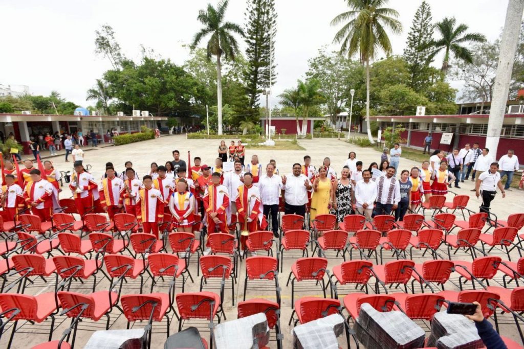 Posteriormente, en Tuxpan, teniendo como sede la Secundaria General no. 1 “Emiliano Zapata”, entregó mesabancos para este plantel y a la Telesecundaria “Patria”, acompañado del alcalde José Manuel Pozos Castro, a quien agradeció por trabajar de forma conjunta con la SEV en la atención de las necesidades en los planteles.