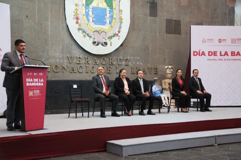Xalapa, Ver., 24 de febrero de 2023.- Al participar en la conmemoración del Día de la Bandera, el secretario de Educación de Veracruz, Zenyazen Escobar García, resaltó el amor y respeto a los símbolos patrios, así como el nacionalismo, humanismo y la colectividad, como parte de lo que plantea la Nueva Escuela Mexicana y que hoy se imparte en las aulas escolares.